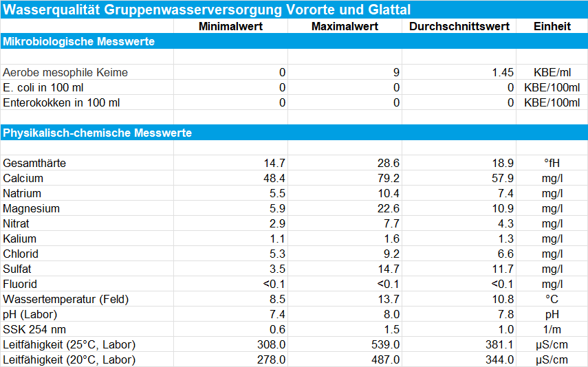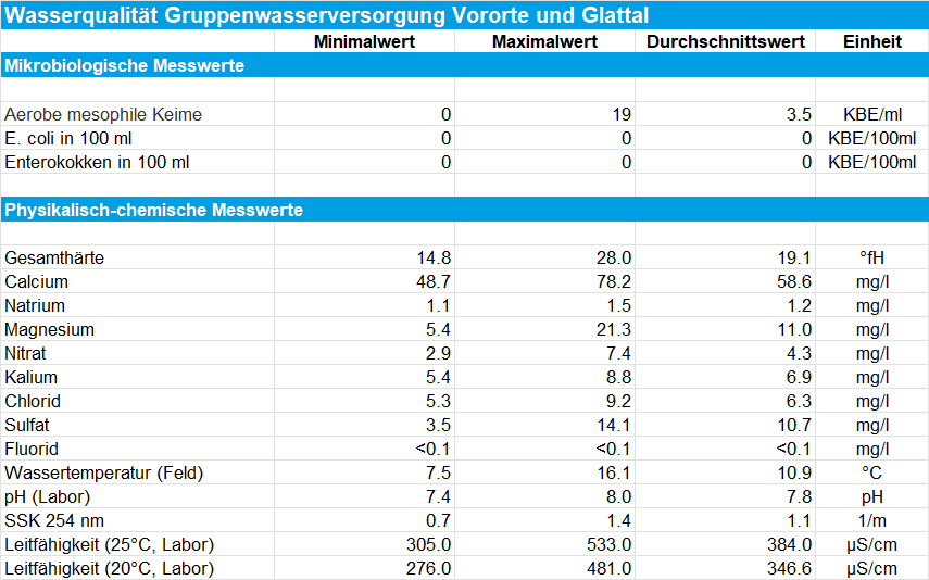Verschiedene Untersuchungsergebnisse der GVG-Trinkwasserproben sind unten zusammengestellt. Die Wasserqualität im Versorgungsnetz der GVG wird zudem mehrfach durch Qualitätskontrollen unserer Wasserlieferanten, der Wasserversorgung Zürich und Stadtwerk Winterthur, sichergestellt. Beide Wasserversorgungsunternehmen konnten die Qualitätsanforderungen jederzeit erfüllen.